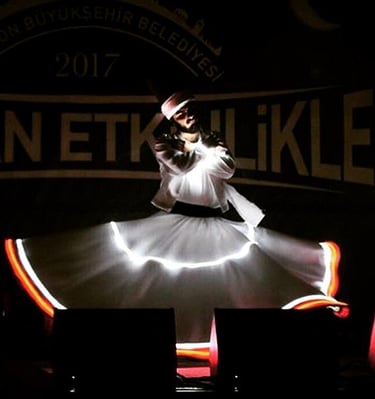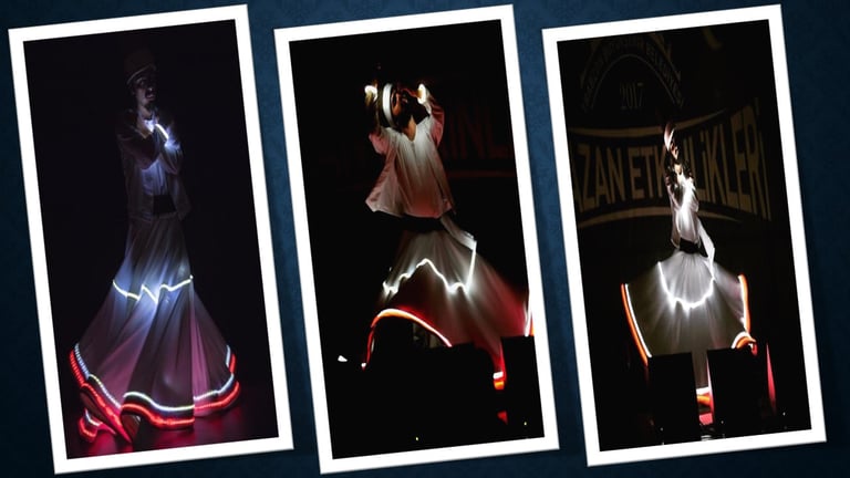 Modern sahne teknolojileriyle harmanlanmış ışıklı kostümlerimiz sayesinde sema gösterisini bambaşka bir boyuta taşıyoruz. Işık efektleriyle desteklenen dönüşler, gece organizasyonlarında büyüleyici bir atmosfer oluşturur ve izleyenler üzerinde güçlü bir etki bırakır.